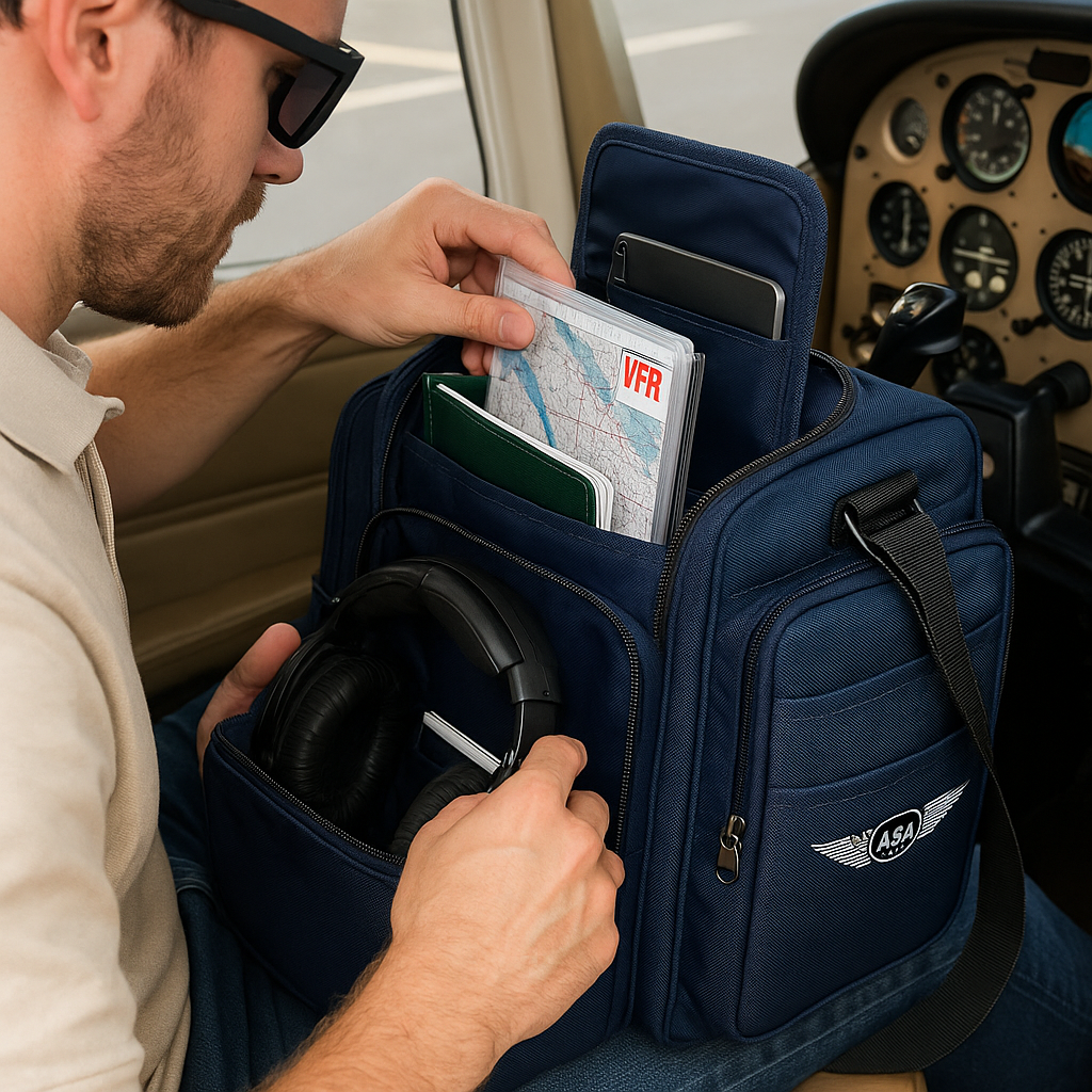 Durable and organized, this navy flight bag keeps your charts, headset, logbook, and gear neatly stored. Multiple compartments, reinforced handles, and a padded shoulder strap make it perfect for both training and professional flights